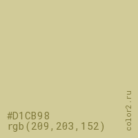 Цвет #D1CB98 в цветовой модели RGB обозначается тремя октетами (209, 203, 152) в десятичном формате и #D1CB98 в шестнадцатиричном (hex) формате, которые являются интенсивностью красного 209 (hex D1), интенсивность зелёного 203 (hex CB) и интенсивность синего 152 (hex 98).