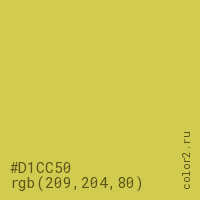 Цвет #D1CC50 в цветовой модели RGB обозначается тремя октетами (209, 204, 80) в десятичном формате и #D1CC50 в шестнадцатиричном (hex) формате, которые являются интенсивностью красного 209 (hex D1), интенсивность зелёного 204 (hex CC) и интенсивность синего 80 (hex 50).