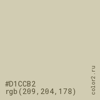 Цвет #D1CCB2 в цветовой модели RGB обозначается тремя октетами (209, 204, 178) в десятичном формате и #D1CCB2 в шестнадцатиричном (hex) формате, которые являются интенсивностью красного 209 (hex D1), интенсивность зелёного 204 (hex CC) и интенсивность синего 178 (hex B2).