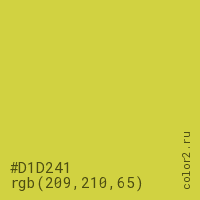 Цвет #D1D241 в цветовой модели RGB обозначается тремя октетами (209, 210, 65) в десятичном формате и #D1D241 в шестнадцатиричном (hex) формате, которые являются интенсивностью красного 209 (hex D1), интенсивность зелёного 210 (hex D2) и интенсивность синего 65 (hex 41).