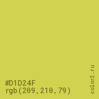 Цвет #D1D24F в цветовой модели RGB обозначается тремя октетами (209, 210, 79) в десятичном формате и #D1D24F в шестнадцатиричном (hex) формате, которые являются интенсивностью красного 209 (hex D1), интенсивность зелёного 210 (hex D2) и интенсивность синего 79 (hex 4F).