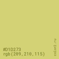 Цвет #D1D273 в цветовой модели RGB обозначается тремя октетами (209, 210, 115) в десятичном формате и #D1D273 в шестнадцатиричном (hex) формате, которые являются интенсивностью красного 209 (hex D1), интенсивность зелёного 210 (hex D2) и интенсивность синего 115 (hex 73).