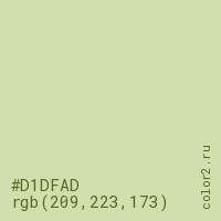 Цвет #D1DFAD в цветовой модели RGB обозначается тремя октетами (209, 223, 173) в десятичном формате и #D1DFAD в шестнадцатиричном (hex) формате, которые являются интенсивностью красного 209 (hex D1), интенсивность зелёного 223 (hex DF) и интенсивность синего 173 (hex AD).