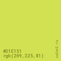 Цвет #D1E151 в цветовой модели RGB обозначается тремя октетами (209, 225, 81) в десятичном формате и #D1E151 в шестнадцатиричном (hex) формате, которые являются интенсивностью красного 209 (hex D1), интенсивность зелёного 225 (hex E1) и интенсивность синего 81 (hex 51).