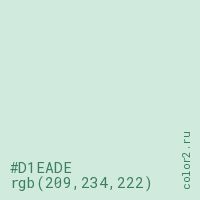 Цвет #D1EADE в цветовой модели RGB обозначается тремя октетами (209, 234, 222) в десятичном формате и #D1EADE в шестнадцатиричном (hex) формате, которые являются интенсивностью красного 209 (hex D1), интенсивность зелёного 234 (hex EA) и интенсивность синего 222 (hex DE).
