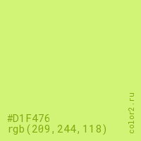 Цвет #D1F476 в цветовой модели RGB обозначается тремя октетами (209, 244, 118) в десятичном формате и #D1F476 в шестнадцатиричном (hex) формате, которые являются интенсивностью красного 209 (hex D1), интенсивность зелёного 244 (hex F4) и интенсивность синего 118 (hex 76).