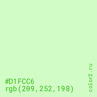 Цвет #D1FCC6 в цветовой модели RGB обозначается тремя октетами (209, 252, 198) в десятичном формате и #D1FCC6 в шестнадцатиричном (hex) формате, которые являются интенсивностью красного 209 (hex D1), интенсивность зелёного 252 (hex FC) и интенсивность синего 198 (hex C6).