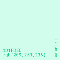 Цвет #D1FDEC в цветовой модели RGB обозначается тремя октетами (209, 253, 236) в десятичном формате и #D1FDEC в шестнадцатиричном (hex) формате, которые являются интенсивностью красного 209 (hex D1), интенсивность зелёного 253 (hex FD) и интенсивность синего 236 (hex EC).