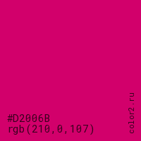 Цвет #D2006B в цветовой модели RGB обозначается тремя октетами (210, 0, 107) в десятичном формате и #D2006B в шестнадцатиричном (hex) формате, которые являются интенсивностью красного 210 (hex D2), интенсивность зелёного 0 (hex 00) и интенсивность синего 107 (hex 6B).