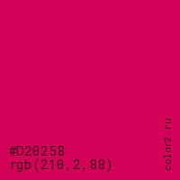 Цвет #D20258 в цветовой модели RGB обозначается тремя октетами (210, 2, 88) в десятичном формате и #D20258 в шестнадцатиричном (hex) формате, которые являются интенсивностью красного 210 (hex D2), интенсивность зелёного 2 (hex 02) и интенсивность синего 88 (hex 58).