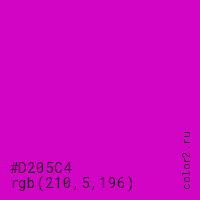 Цвет #D205C4 в цветовой модели RGB обозначается тремя октетами (210, 5, 196) в десятичном формате и #D205C4 в шестнадцатиричном (hex) формате, которые являются интенсивностью красного 210 (hex D2), интенсивность зелёного 5 (hex 05) и интенсивность синего 196 (hex C4).