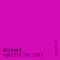 Цвет #D20AB4 в цветовой модели RGB обозначается тремя октетами (210, 10, 180) в десятичном формате и #D20AB4 в шестнадцатиричном (hex) формате, которые являются интенсивностью красного 210 (hex D2), интенсивность зелёного 10 (hex 0A) и интенсивность синего 180 (hex B4).