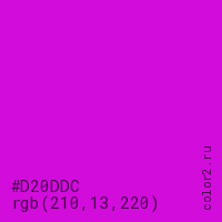 Цвет #D20DDC в цветовой модели RGB обозначается тремя октетами (210, 13, 220) в десятичном формате и #D20DDC в шестнадцатиричном (hex) формате, которые являются интенсивностью красного 210 (hex D2), интенсивность зелёного 13 (hex 0D) и интенсивность синего 220 (hex DC).