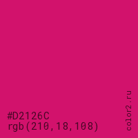 Цвет #D2126C в цветовой модели RGB обозначается тремя октетами (210, 18, 108) в десятичном формате и #D2126C в шестнадцатиричном (hex) формате, которые являются интенсивностью красного 210 (hex D2), интенсивность зелёного 18 (hex 12) и интенсивность синего 108 (hex 6C).