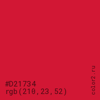 Цвет #D21734 в цветовой модели RGB обозначается тремя октетами (210, 23, 52) в десятичном формате и #D21734 в шестнадцатиричном (hex) формате, которые являются интенсивностью красного 210 (hex D2), интенсивность зелёного 23 (hex 17) и интенсивность синего 52 (hex 34).