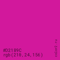 Цвет #D2189C в цветовой модели RGB обозначается тремя октетами (210, 24, 156) в десятичном формате и #D2189C в шестнадцатиричном (hex) формате, которые являются интенсивностью красного 210 (hex D2), интенсивность зелёного 24 (hex 18) и интенсивность синего 156 (hex 9C).