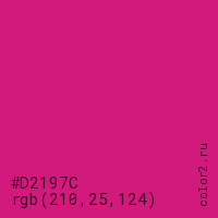 Цвет #D2197C в цветовой модели RGB обозначается тремя октетами (210, 25, 124) в десятичном формате и #D2197C в шестнадцатиричном (hex) формате, которые являются интенсивностью красного 210 (hex D2), интенсивность зелёного 25 (hex 19) и интенсивность синего 124 (hex 7C).