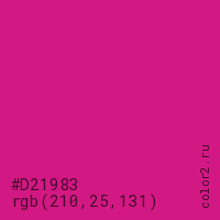 Цвет #D21983 в цветовой модели RGB обозначается тремя октетами (210, 25, 131) в десятичном формате и #D21983 в шестнадцатиричном (hex) формате, которые являются интенсивностью красного 210 (hex D2), интенсивность зелёного 25 (hex 19) и интенсивность синего 131 (hex 83).