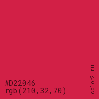 Цвет #D22046 в цветовой модели RGB обозначается тремя октетами (210, 32, 70) в десятичном формате и #D22046 в шестнадцатиричном (hex) формате, которые являются интенсивностью красного 210 (hex D2), интенсивность зелёного 32 (hex 20) и интенсивность синего 70 (hex 46).