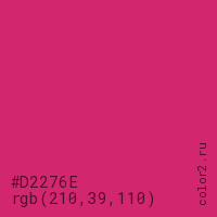 Цвет #D2276E в цветовой модели RGB обозначается тремя октетами (210, 39, 110) в десятичном формате и #D2276E в шестнадцатиричном (hex) формате, которые являются интенсивностью красного 210 (hex D2), интенсивность зелёного 39 (hex 27) и интенсивность синего 110 (hex 6E).
