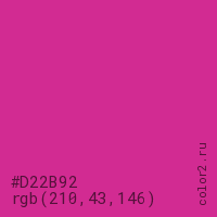 Цвет #D22B92 в цветовой модели RGB обозначается тремя октетами (210, 43, 146) в десятичном формате и #D22B92 в шестнадцатиричном (hex) формате, которые являются интенсивностью красного 210 (hex D2), интенсивность зелёного 43 (hex 2B) и интенсивность синего 146 (hex 92).