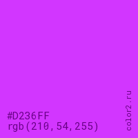 Цвет #D236FF в цветовой модели RGB обозначается тремя октетами (210, 54, 255) в десятичном формате и #D236FF в шестнадцатиричном (hex) формате, которые являются интенсивностью красного 210 (hex D2), интенсивность зелёного 54 (hex 36) и интенсивность синего 255 (hex FF).