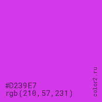 Цвет #D239E7 в цветовой модели RGB обозначается тремя октетами (210, 57, 231) в десятичном формате и #D239E7 в шестнадцатиричном (hex) формате, которые являются интенсивностью красного 210 (hex D2), интенсивность зелёного 57 (hex 39) и интенсивность синего 231 (hex E7).