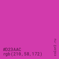 Цвет #D23AAC в цветовой модели RGB обозначается тремя октетами (210, 58, 172) в десятичном формате и #D23AAC в шестнадцатиричном (hex) формате, которые являются интенсивностью красного 210 (hex D2), интенсивность зелёного 58 (hex 3A) и интенсивность синего 172 (hex AC).