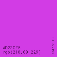 Цвет #D23CE5 в цветовой модели RGB обозначается тремя октетами (210, 60, 229) в десятичном формате и #D23CE5 в шестнадцатиричном (hex) формате, которые являются интенсивностью красного 210 (hex D2), интенсивность зелёного 60 (hex 3C) и интенсивность синего 229 (hex E5).