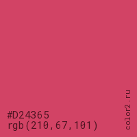 Цвет #D24365 в цветовой модели RGB обозначается тремя октетами (210, 67, 101) в десятичном формате и #D24365 в шестнадцатиричном (hex) формате, которые являются интенсивностью красного 210 (hex D2), интенсивность зелёного 67 (hex 43) и интенсивность синего 101 (hex 65).