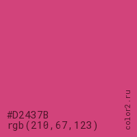 Цвет #D2437B в цветовой модели RGB обозначается тремя октетами (210, 67, 123) в десятичном формате и #D2437B в шестнадцатиричном (hex) формате, которые являются интенсивностью красного 210 (hex D2), интенсивность зелёного 67 (hex 43) и интенсивность синего 123 (hex 7B).