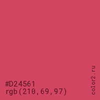 Цвет #D24561 в цветовой модели RGB обозначается тремя октетами (210, 69, 97) в десятичном формате и #D24561 в шестнадцатиричном (hex) формате, которые являются интенсивностью красного 210 (hex D2), интенсивность зелёного 69 (hex 45) и интенсивность синего 97 (hex 61).
