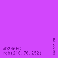 Цвет #D246FC в цветовой модели RGB обозначается тремя октетами (210, 70, 252) в десятичном формате и #D246FC в шестнадцатиричном (hex) формате, которые являются интенсивностью красного 210 (hex D2), интенсивность зелёного 70 (hex 46) и интенсивность синего 252 (hex FC).