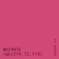 Цвет #D24876 в цветовой модели RGB обозначается тремя октетами (210, 72, 118) в десятичном формате и #D24876 в шестнадцатиричном (hex) формате, которые являются интенсивностью красного 210 (hex D2), интенсивность зелёного 72 (hex 48) и интенсивность синего 118 (hex 76).