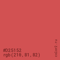 Цвет #D25152 в цветовой модели RGB обозначается тремя октетами (210, 81, 82) в десятичном формате и #D25152 в шестнадцатиричном (hex) формате, которые являются интенсивностью красного 210 (hex D2), интенсивность зелёного 81 (hex 51) и интенсивность синего 82 (hex 52).
