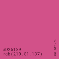 Цвет #D25189 в цветовой модели RGB обозначается тремя октетами (210, 81, 137) в десятичном формате и #D25189 в шестнадцатиричном (hex) формате, которые являются интенсивностью красного 210 (hex D2), интенсивность зелёного 81 (hex 51) и интенсивность синего 137 (hex 89).