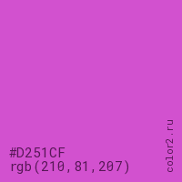 Цвет #D251CF в цветовой модели RGB обозначается тремя октетами (210, 81, 207) в десятичном формате и #D251CF в шестнадцатиричном (hex) формате, которые являются интенсивностью красного 210 (hex D2), интенсивность зелёного 81 (hex 51) и интенсивность синего 207 (hex CF).