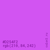Цвет #D254F2 в цветовой модели RGB обозначается тремя октетами (210, 84, 242) в десятичном формате и #D254F2 в шестнадцатиричном (hex) формате, которые являются интенсивностью красного 210 (hex D2), интенсивность зелёного 84 (hex 54) и интенсивность синего 242 (hex F2).