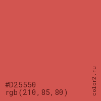 Цвет #D25550 в цветовой модели RGB обозначается тремя октетами (210, 85, 80) в десятичном формате и #D25550 в шестнадцатиричном (hex) формате, которые являются интенсивностью красного 210 (hex D2), интенсивность зелёного 85 (hex 55) и интенсивность синего 80 (hex 50).