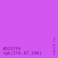 Цвет #D257F0 в цветовой модели RGB обозначается тремя октетами (210, 87, 240) в десятичном формате и #D257F0 в шестнадцатиричном (hex) формате, которые являются интенсивностью красного 210 (hex D2), интенсивность зелёного 87 (hex 57) и интенсивность синего 240 (hex F0).