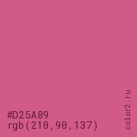 Цвет #D25A89 в цветовой модели RGB обозначается тремя октетами (210, 90, 137) в десятичном формате и #D25A89 в шестнадцатиричном (hex) формате, которые являются интенсивностью красного 210 (hex D2), интенсивность зелёного 90 (hex 5A) и интенсивность синего 137 (hex 89).