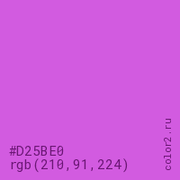 Цвет #D25BE0 в цветовой модели RGB обозначается тремя октетами (210, 91, 224) в десятичном формате и #D25BE0 в шестнадцатиричном (hex) формате, которые являются интенсивностью красного 210 (hex D2), интенсивность зелёного 91 (hex 5B) и интенсивность синего 224 (hex E0).