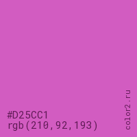 Цвет #D25CC1 в цветовой модели RGB обозначается тремя октетами (210, 92, 193) в десятичном формате и #D25CC1 в шестнадцатиричном (hex) формате, которые являются интенсивностью красного 210 (hex D2), интенсивность зелёного 92 (hex 5C) и интенсивность синего 193 (hex C1).