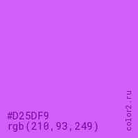 Цвет #D25DF9 в цветовой модели RGB обозначается тремя октетами (210, 93, 249) в десятичном формате и #D25DF9 в шестнадцатиричном (hex) формате, которые являются интенсивностью красного 210 (hex D2), интенсивность зелёного 93 (hex 5D) и интенсивность синего 249 (hex F9).