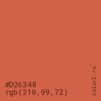 Цвет #D26348 в цветовой модели RGB обозначается тремя октетами (210, 99, 72) в десятичном формате и #D26348 в шестнадцатиричном (hex) формате, которые являются интенсивностью красного 210 (hex D2), интенсивность зелёного 99 (hex 63) и интенсивность синего 72 (hex 48).