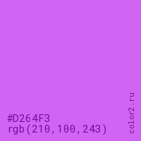 Цвет #D264F3 в цветовой модели RGB обозначается тремя октетами (210, 100, 243) в десятичном формате и #D264F3 в шестнадцатиричном (hex) формате, которые являются интенсивностью красного 210 (hex D2), интенсивность зелёного 100 (hex 64) и интенсивность синего 243 (hex F3).