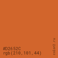 Цвет #D2652C в цветовой модели RGB обозначается тремя октетами (210, 101, 44) в десятичном формате и #D2652C в шестнадцатиричном (hex) формате, которые являются интенсивностью красного 210 (hex D2), интенсивность зелёного 101 (hex 65) и интенсивность синего 44 (hex 2C).