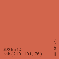 Цвет #D2654C в цветовой модели RGB обозначается тремя октетами (210, 101, 76) в десятичном формате и #D2654C в шестнадцатиричном (hex) формате, которые являются интенсивностью красного 210 (hex D2), интенсивность зелёного 101 (hex 65) и интенсивность синего 76 (hex 4C).