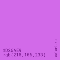 Цвет #D26AE9 в цветовой модели RGB обозначается тремя октетами (210, 106, 233) в десятичном формате и #D26AE9 в шестнадцатиричном (hex) формате, которые являются интенсивностью красного 210 (hex D2), интенсивность зелёного 106 (hex 6A) и интенсивность синего 233 (hex E9).