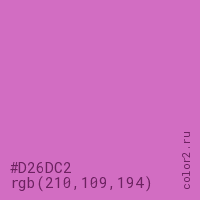 Цвет #D26DC2 в цветовой модели RGB обозначается тремя октетами (210, 109, 194) в десятичном формате и #D26DC2 в шестнадцатиричном (hex) формате, которые являются интенсивностью красного 210 (hex D2), интенсивность зелёного 109 (hex 6D) и интенсивность синего 194 (hex C2).